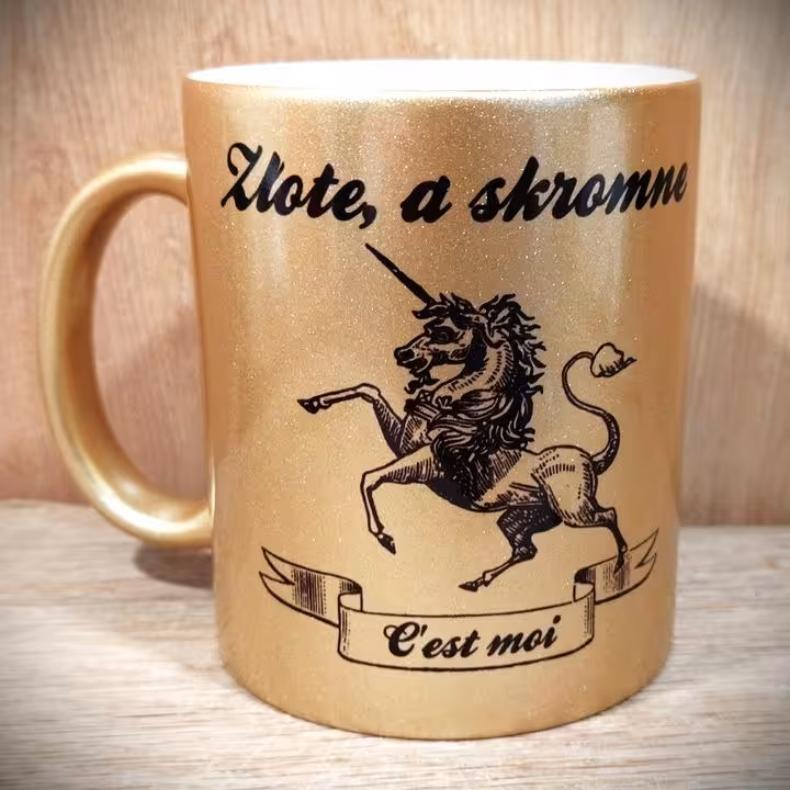 Oferta dotyczy ceramicznego kubka z kolekcji Sarnodzieło z napisem "Złote a skromne".